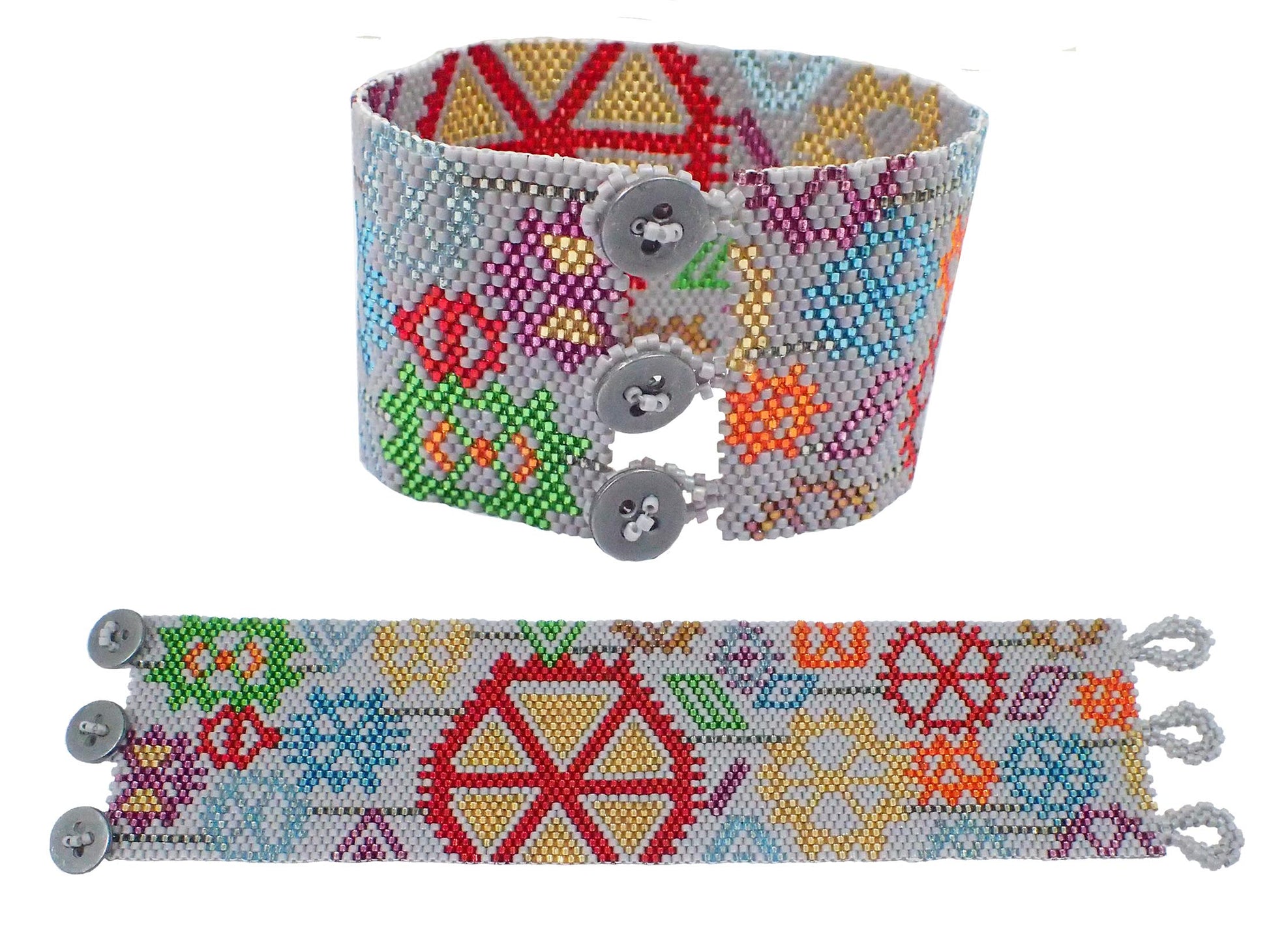 Gears is a 1 3/4" Wide Cuff, stitched with a peyote stitch. The design of this style measures 6 7/8" long. We add enough beads for a 7" bracelet. Please note if you need more background beads for a longer cuff write down in the notes section when you order or email me you need more beads. We will add extra background beads. You will equally add rows to each side of the design to obtain the length desired. The kit contains all the beads, needle thread and colored directions, graph and word chart as well as the 3 metal buttons.