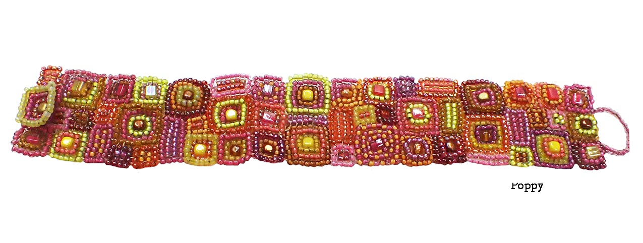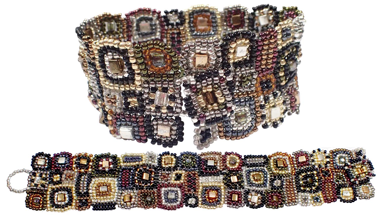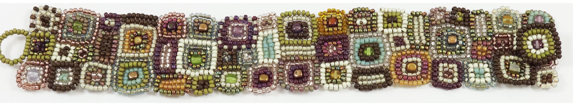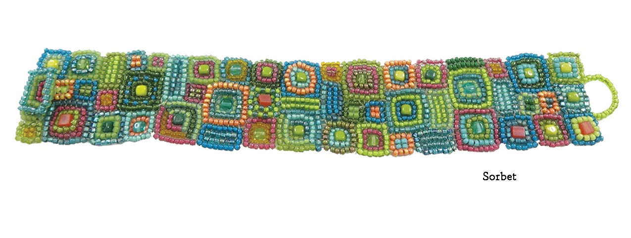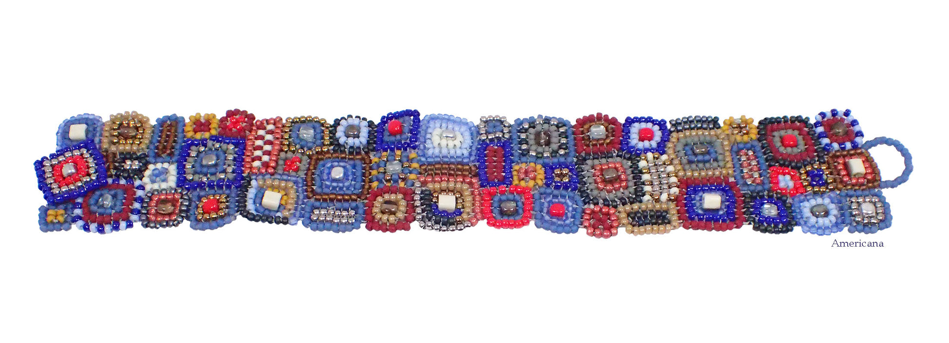 A bracelet inspired by the incredible quilts made by the women of the Gee's Bend area in Alabama. Beginners will learn a version of the square stitch called a rounded square stitch. Each rectangle and square shape is explained in the directions. In each kit you will get a colored picture of the color combination, plus the directions now include a bead color chart! We have taken the guess work away. All shapes are stitched separately. Like a quilt the shapes are assembled together to complete the bracelet.
