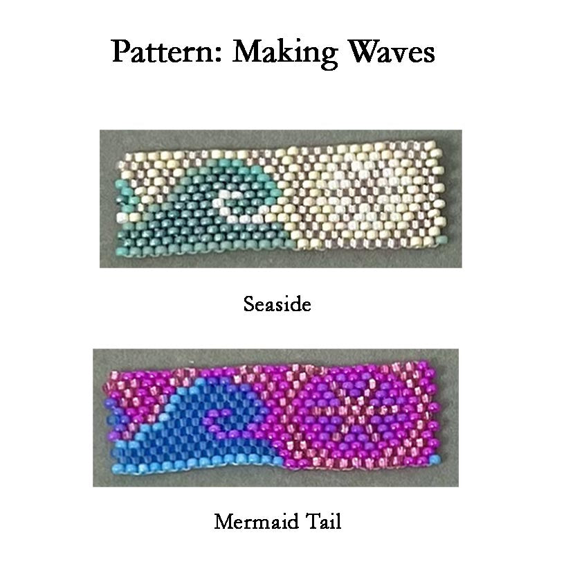 Making Waves pattern is a 12 wide repeating pattern that includes both a waves plus center medallion, or a waves only option. Example pictures use size 15 seed beads but any size seed bead can be used. Pattern includes a picture graph and word graph.