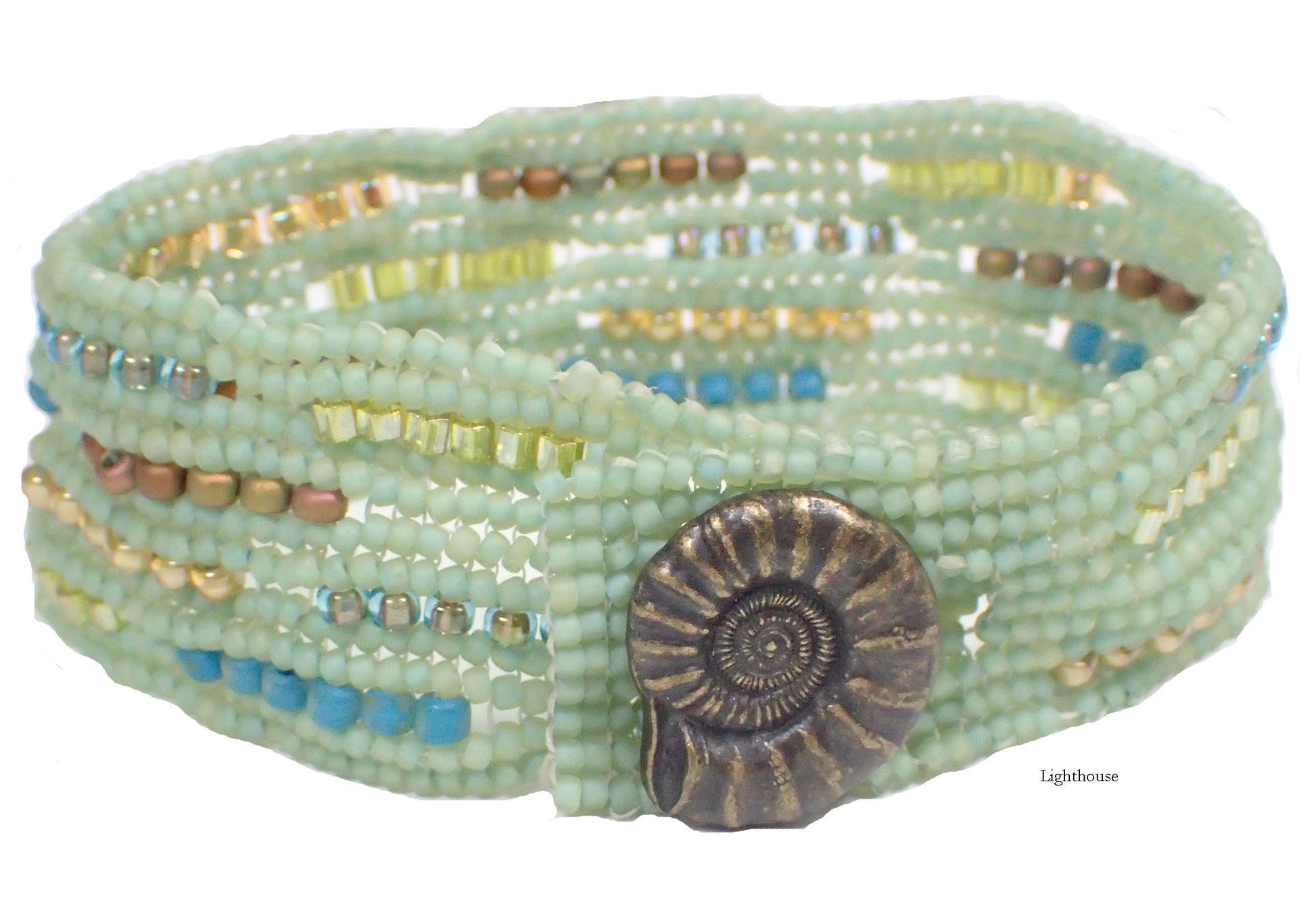 Lori Schmidt shared that the inspiration for this design came from a fishing trip with her husband. She noticed the fish swimming in lanes, which led her to create filler lanes using the Ndebele stitch—resulting in this beautiful cuff. A big thank you to Lori for this exquisite design!