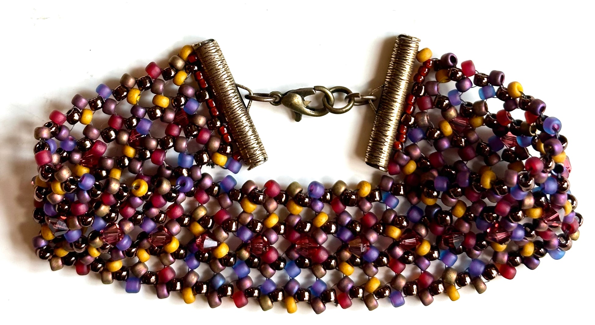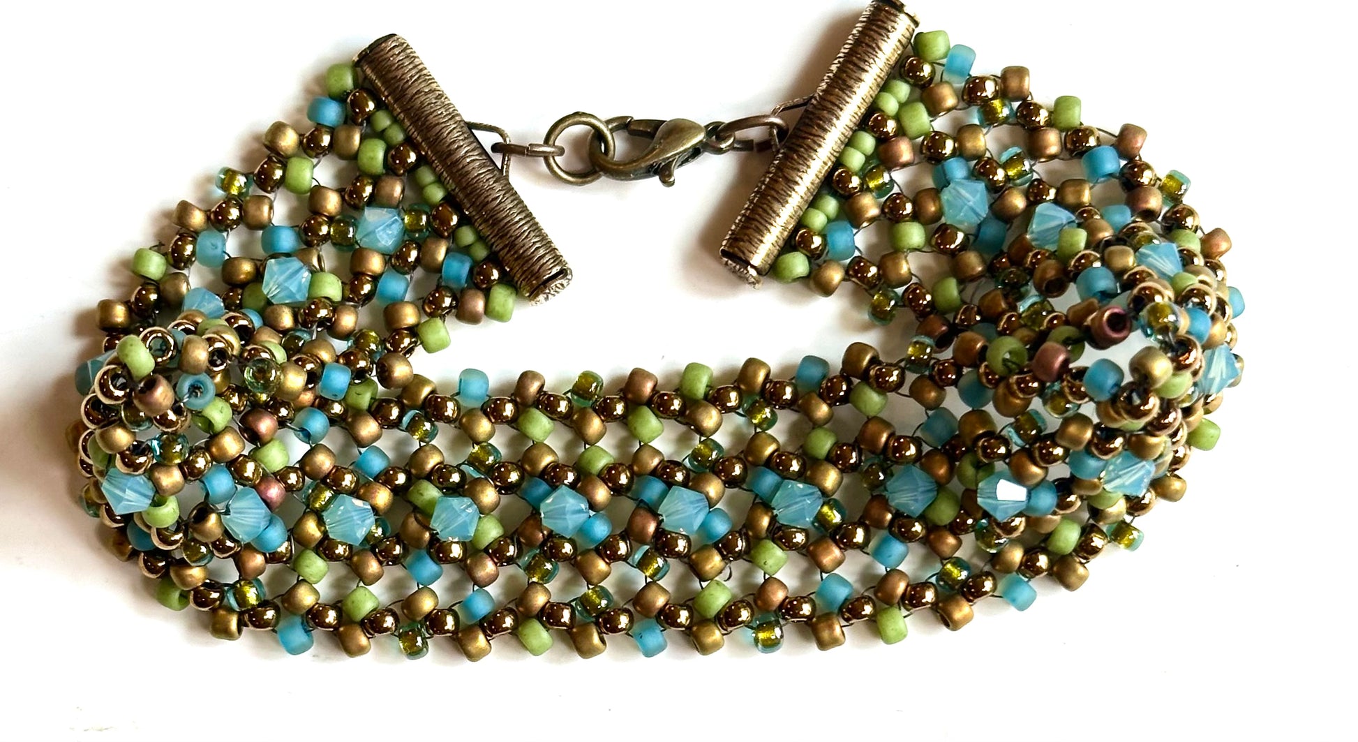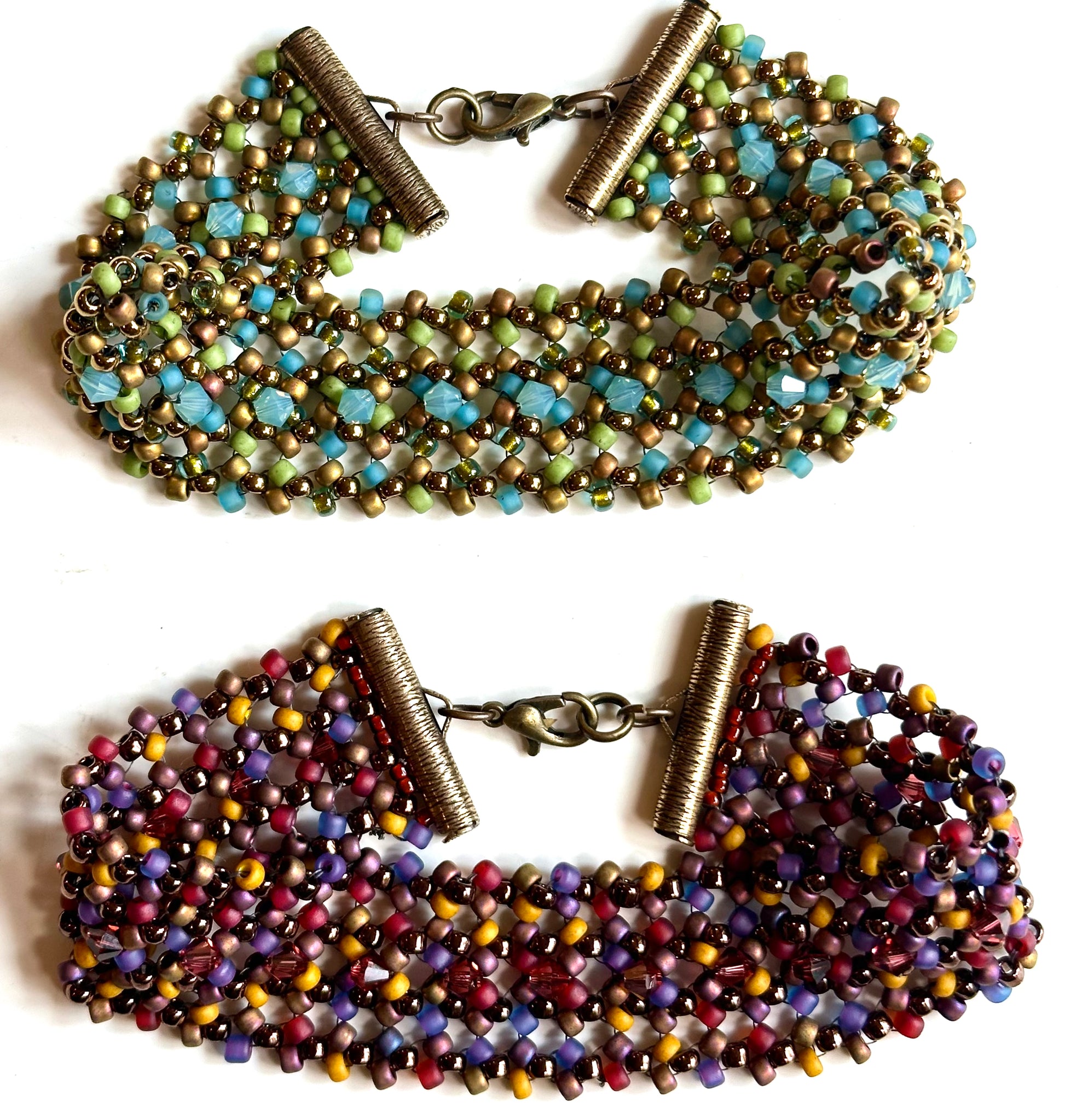 This is one of the most comfortable bracelets to wear. Also because of the openness of the stitch technique you can add fun embellishments. I chose to just add a row of crystals, so have fun with this pattern.
